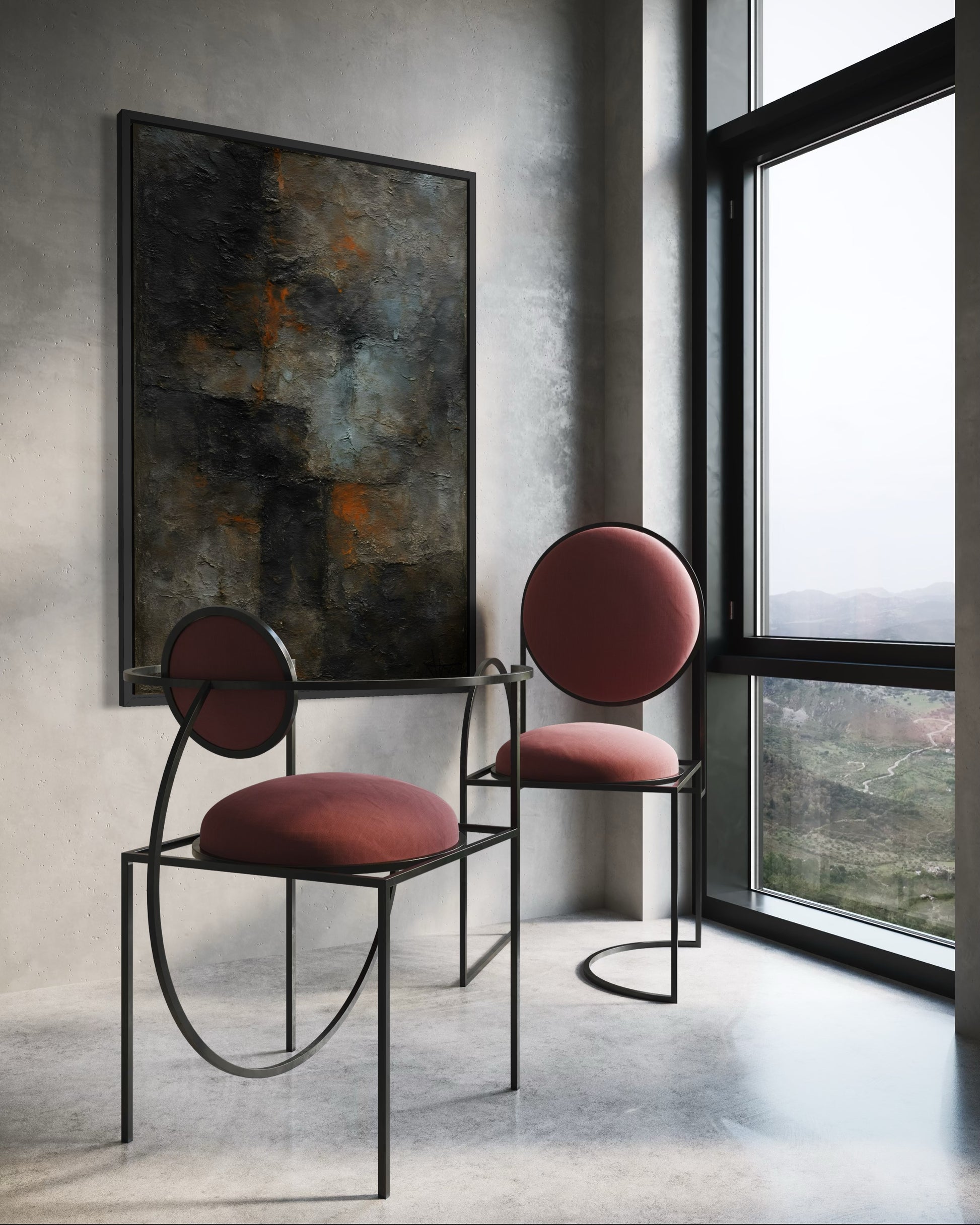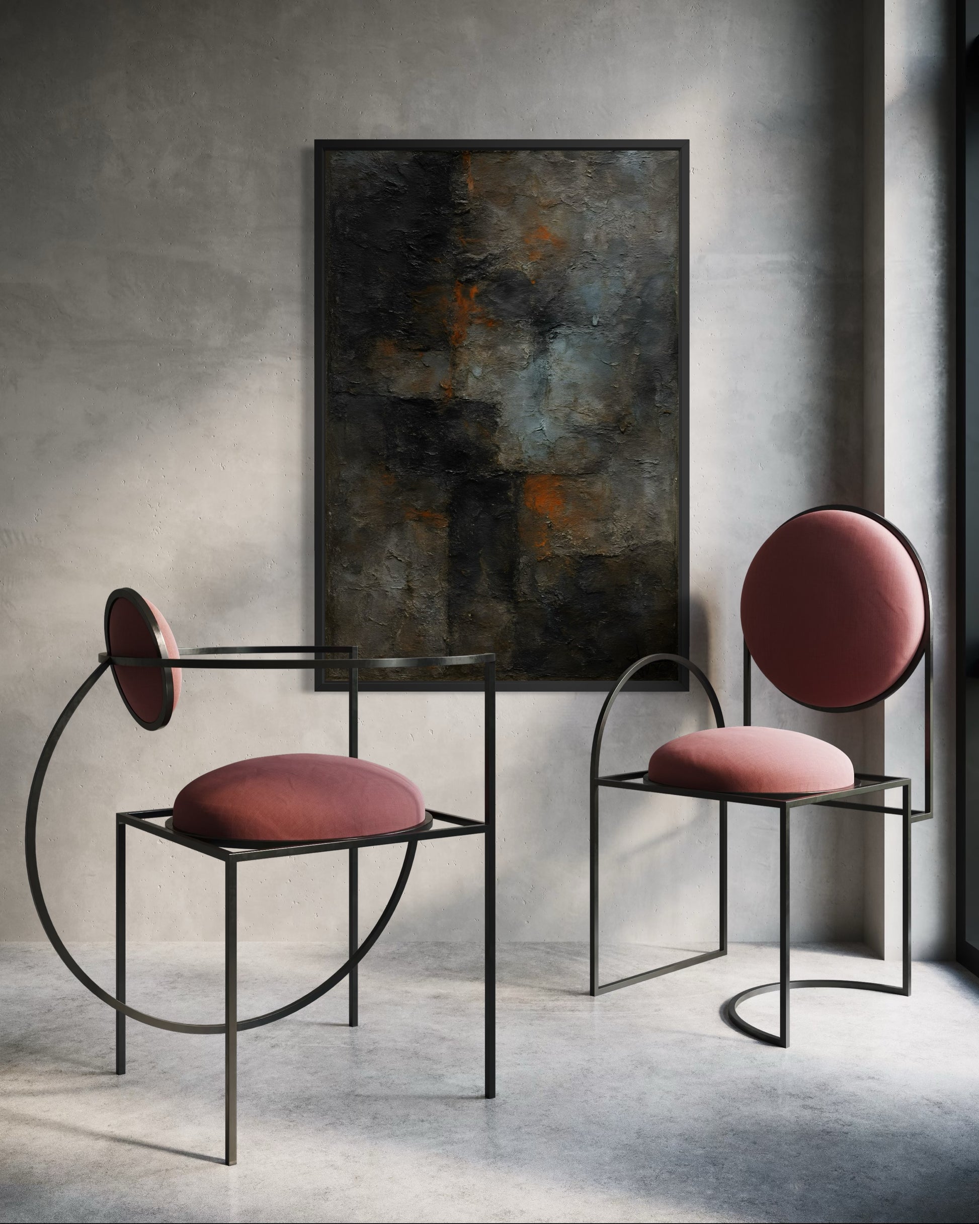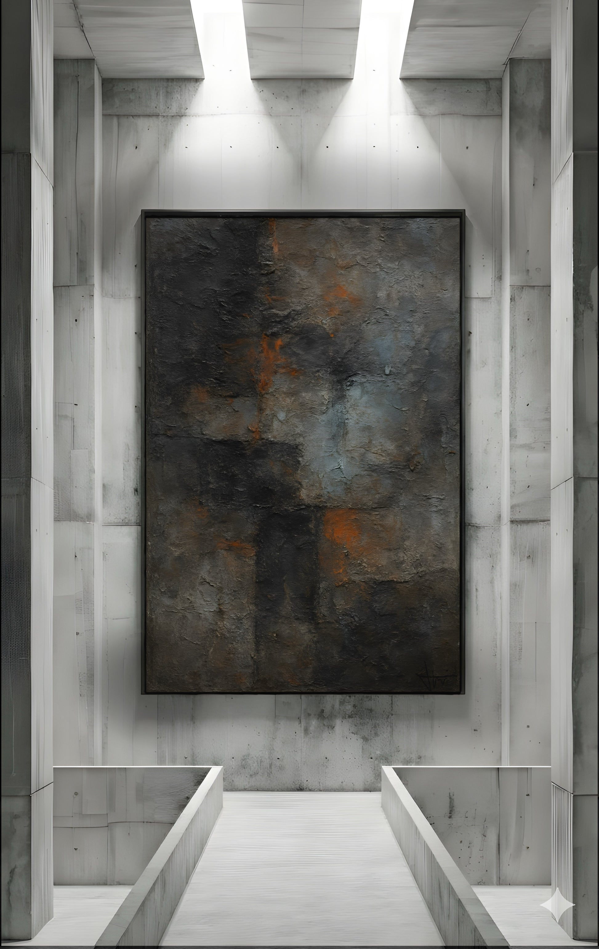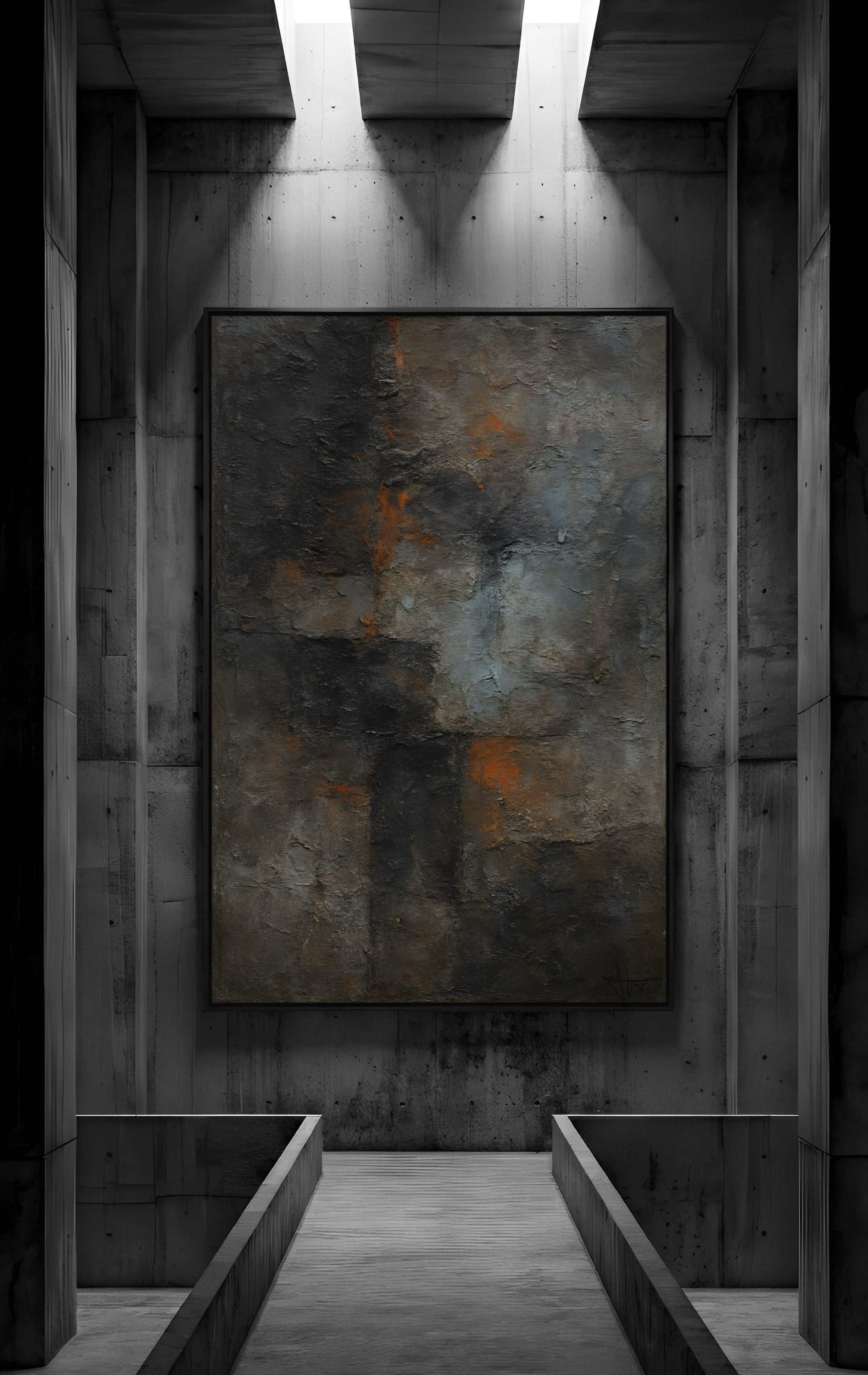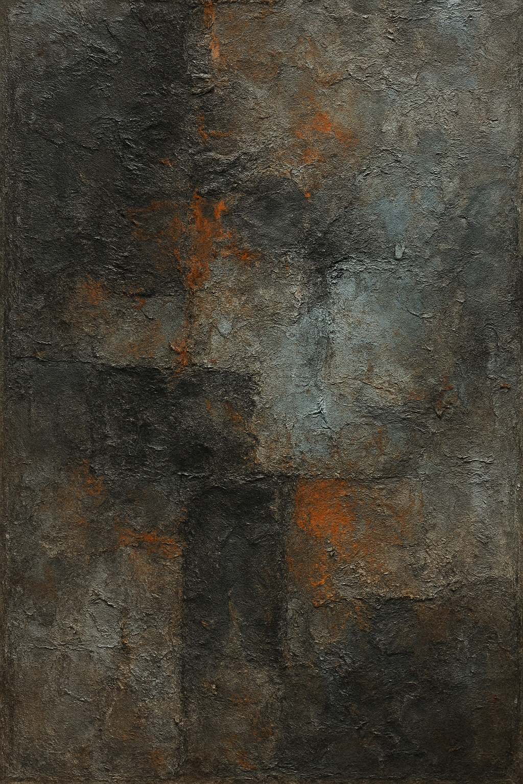 "OXIDE-115" dokumentuje proces utleniania i degradacji powierzchni, eksponując warstwy rdzy na tle chłodnego betonu. Jest to najbardziej „nasycona” jednostka w bieżącym cyklu, reprezentująca trwałość w procesie zmiany.