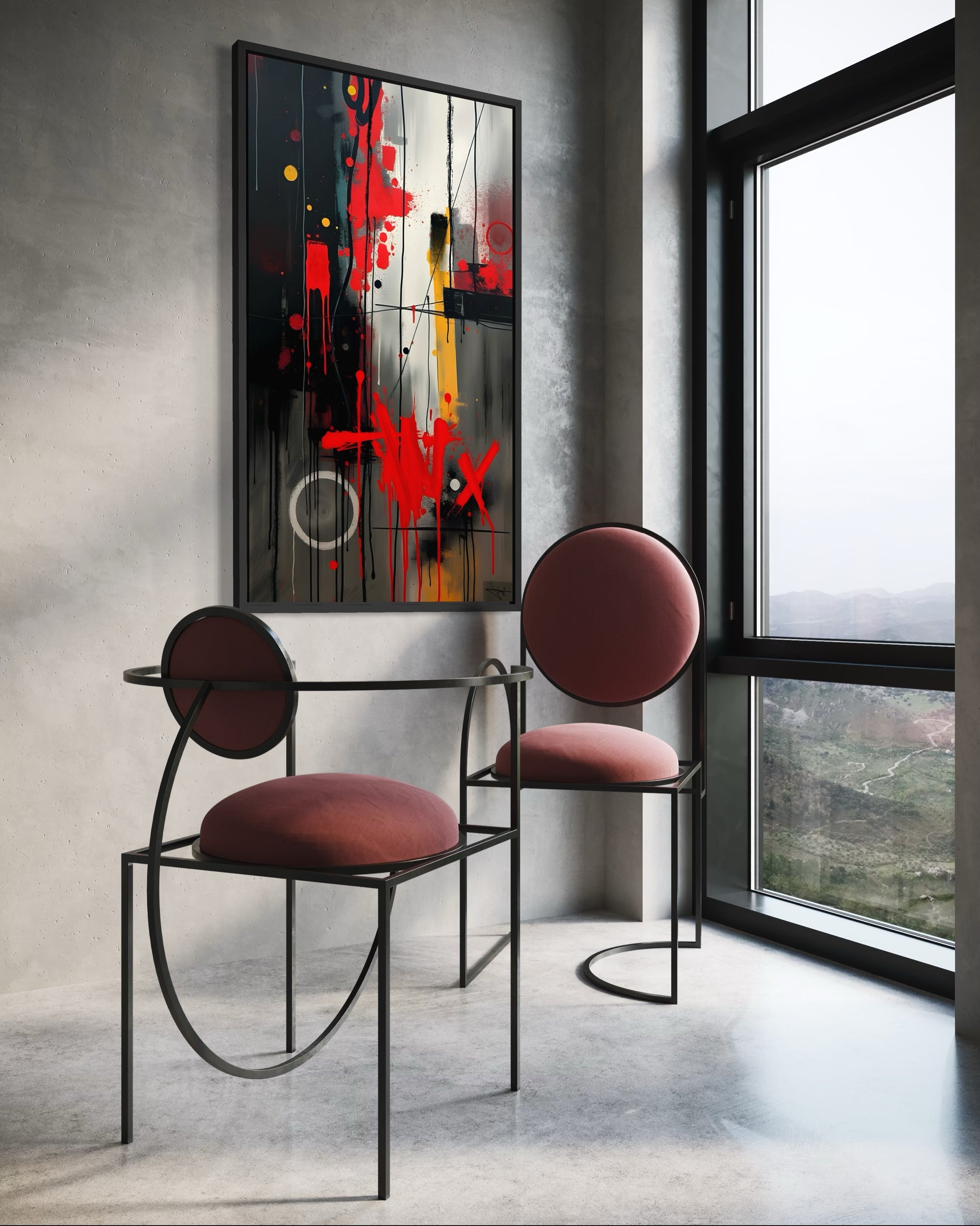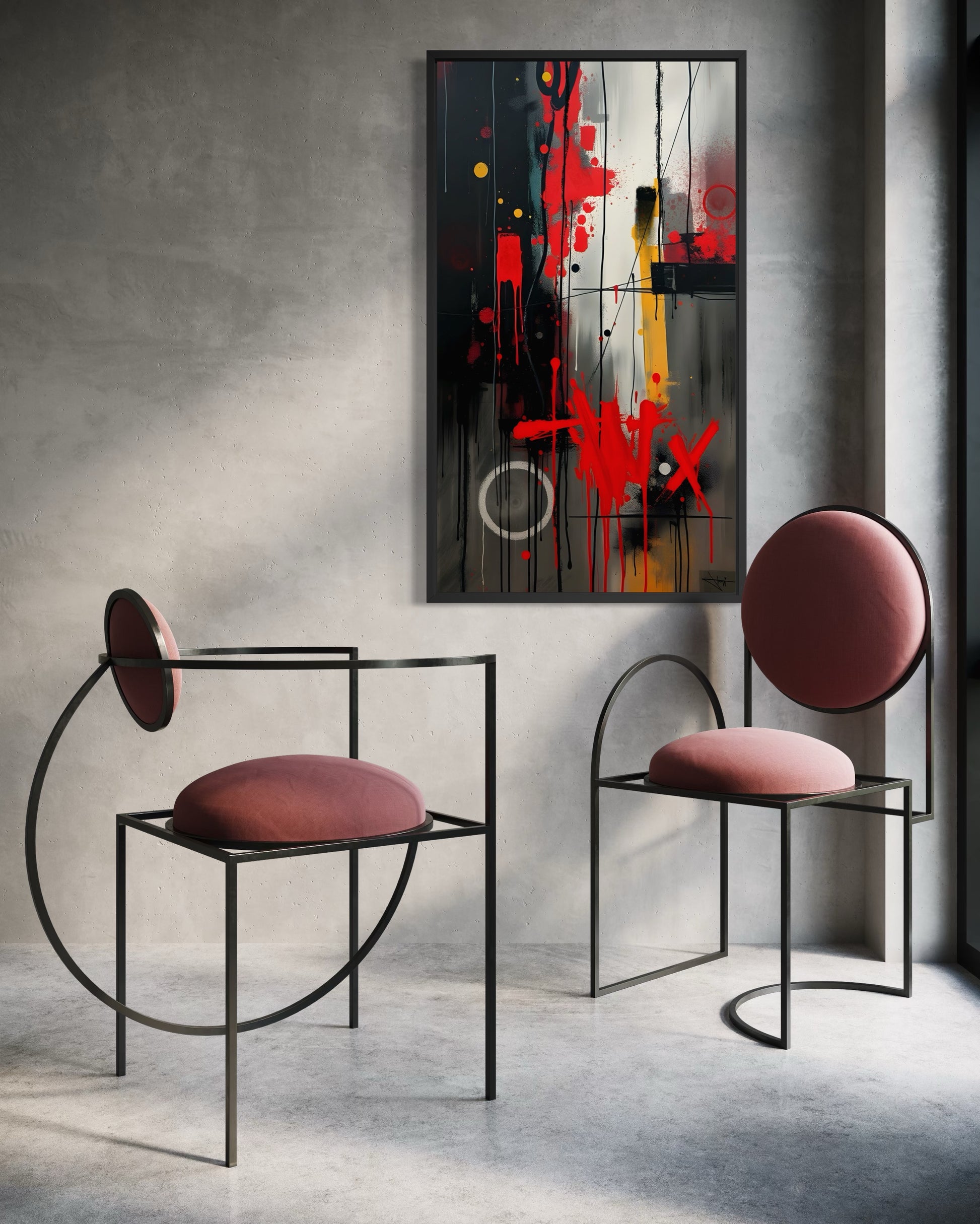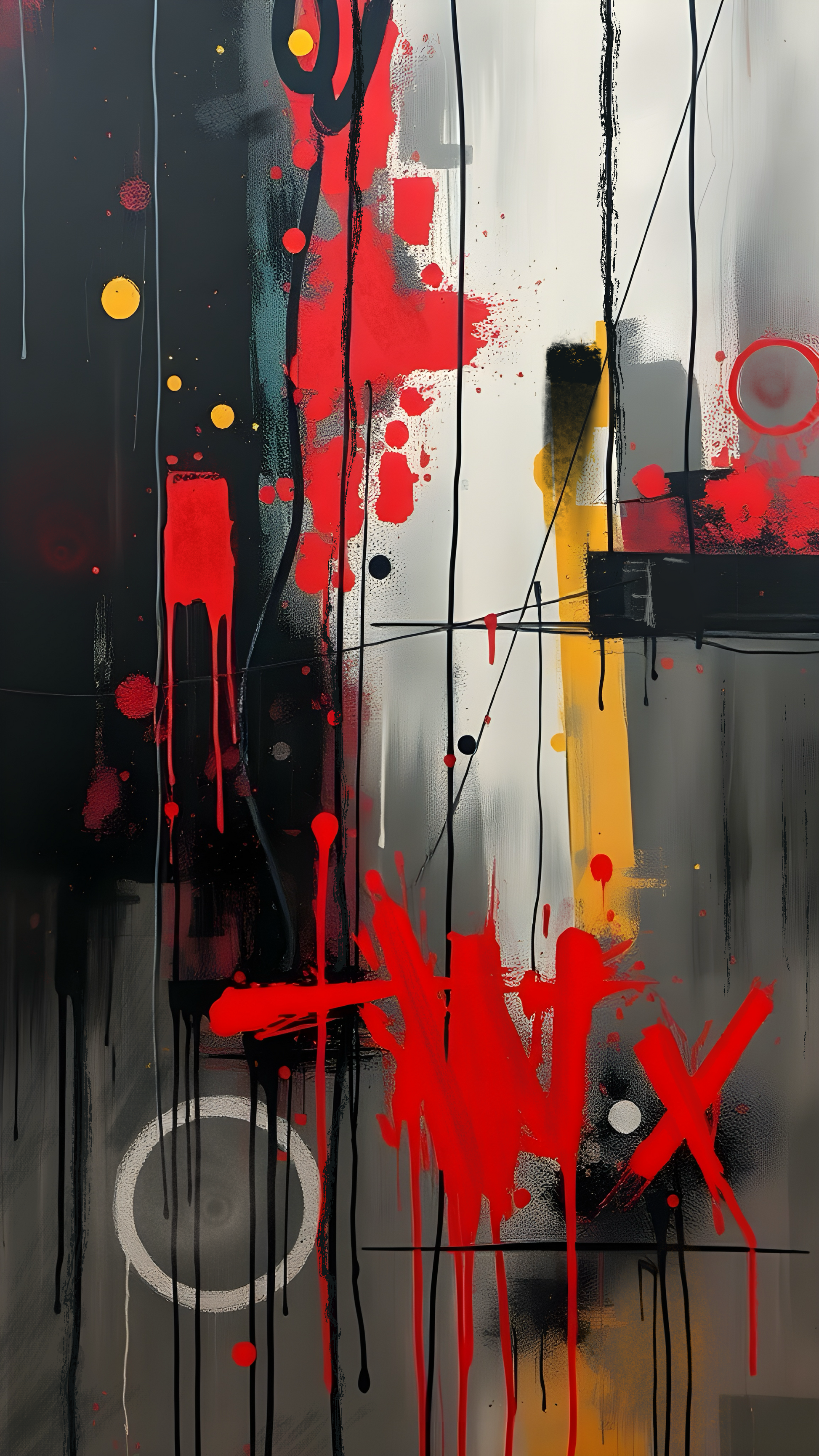„Ustrukturyzowane pionowe podziały spotykają się z nieokiełznanymi, ekspresywnymi gestami. Czerwone i żółte akcenty działają jak wizualne zerwania, uwydatniając napięcie między porządkiem a spontaniczną ekspresją.”