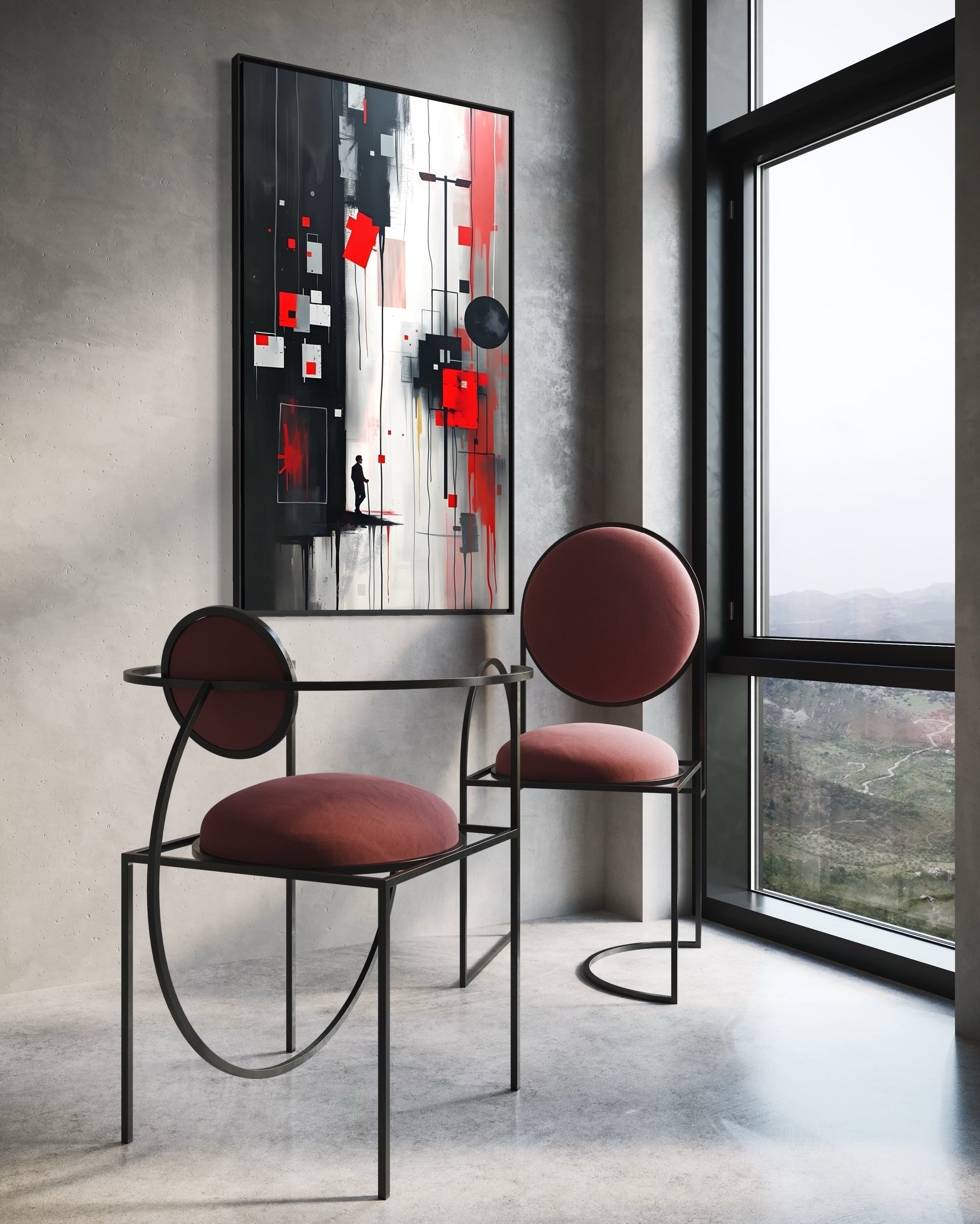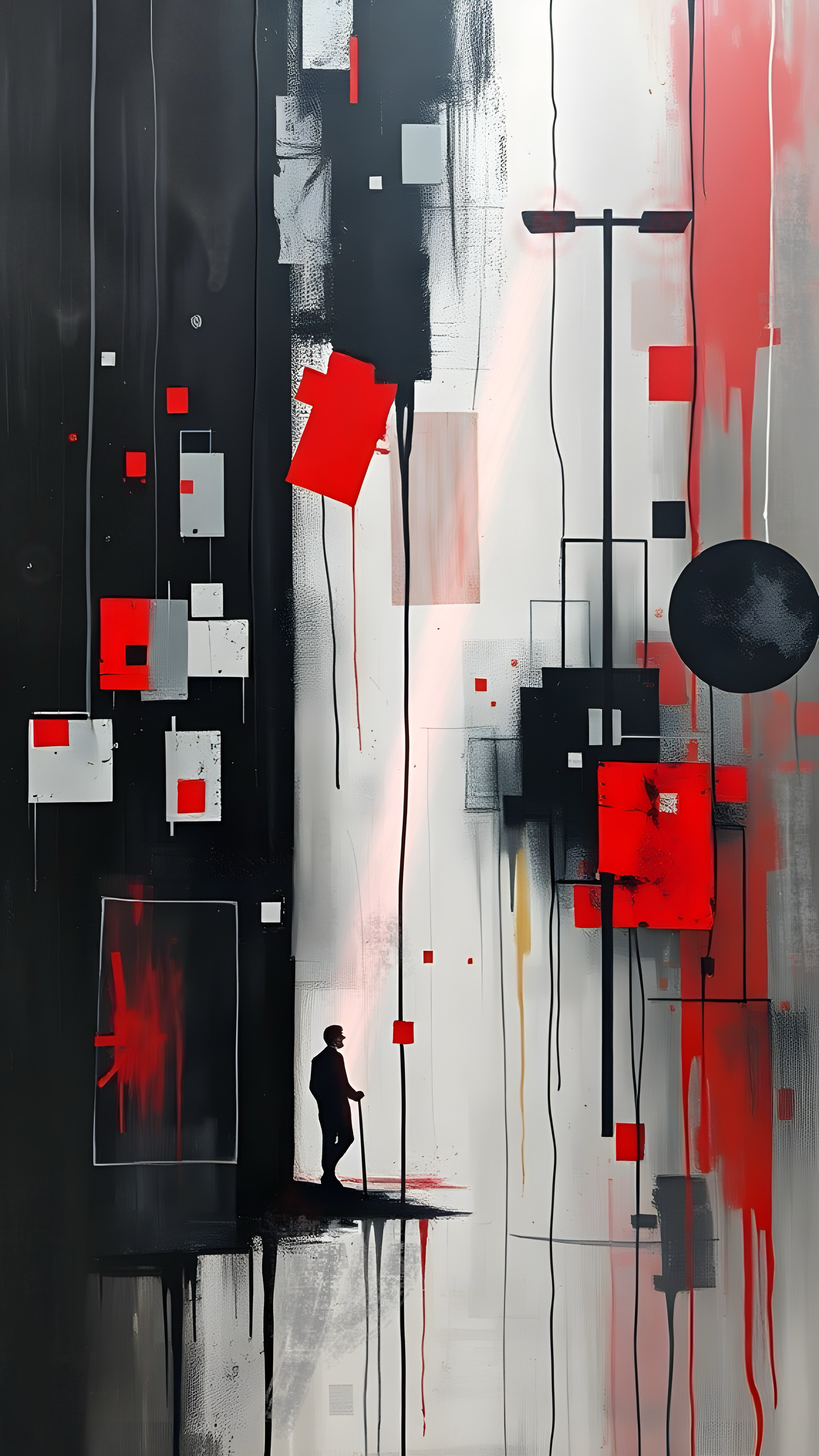 „Siatki kształtów rozpływają się w spryskane tekstury i unoszące się linie. Pojawienie się samotnej postaci podkreśla skalę otaczającego abstrakcyjnego środowiska, w którym geometryczna architektura łączy się z energią graffiti.”